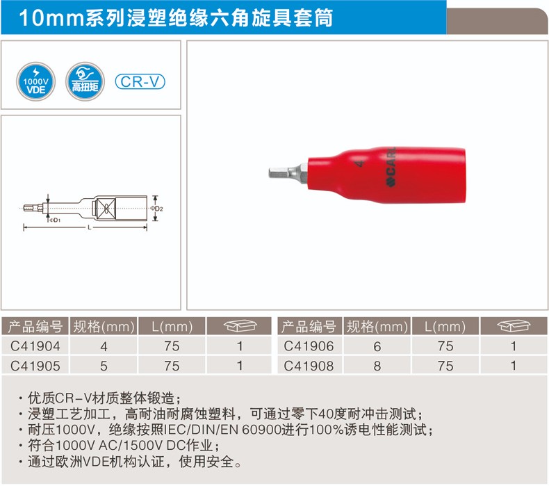 首页 >> 产品分类 >>VDE绝缘工具系列 >>紧固类 >> 10mm系列浸塑绝缘六角旋具套筒