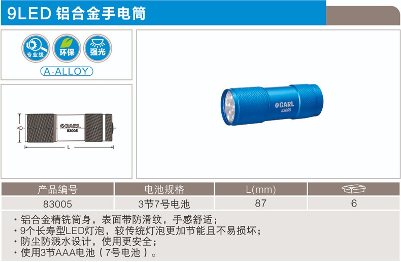 首页 >> 产品分类 >>电子电工系列 >>照明类 >> 9LED 铝合金手电筒
